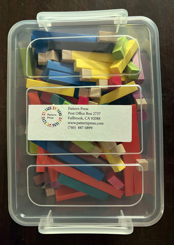 Large set of wooden Cuisenaire® rods contains 177 rods. Set includes 50 white, 32 red, 25 light green, 15 purple, 8 yellow, 9 dark green, 9 black, 9 brown, 10 blue and 10 orange rods.